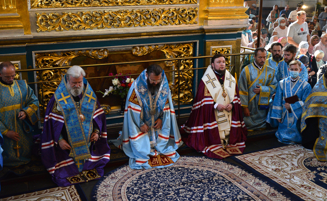 В завершение богослужения архипастыри, духовенство и миряне коленопреклоненно просили Пресвятую Богородицу у чудотворного Ее образа Одигитрии Смоленской о милостивом заступничестве и путеводительстве во все дни жизни нашей.