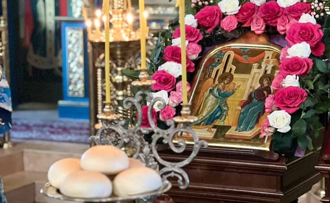 Под пение тропаря «Спаси, Господи, люди твоя…» Крест был пронесен по храму, а затем возложен на аналой для поклонения верующих рядом с иконой Благовещения Пресвятой Богородицы.