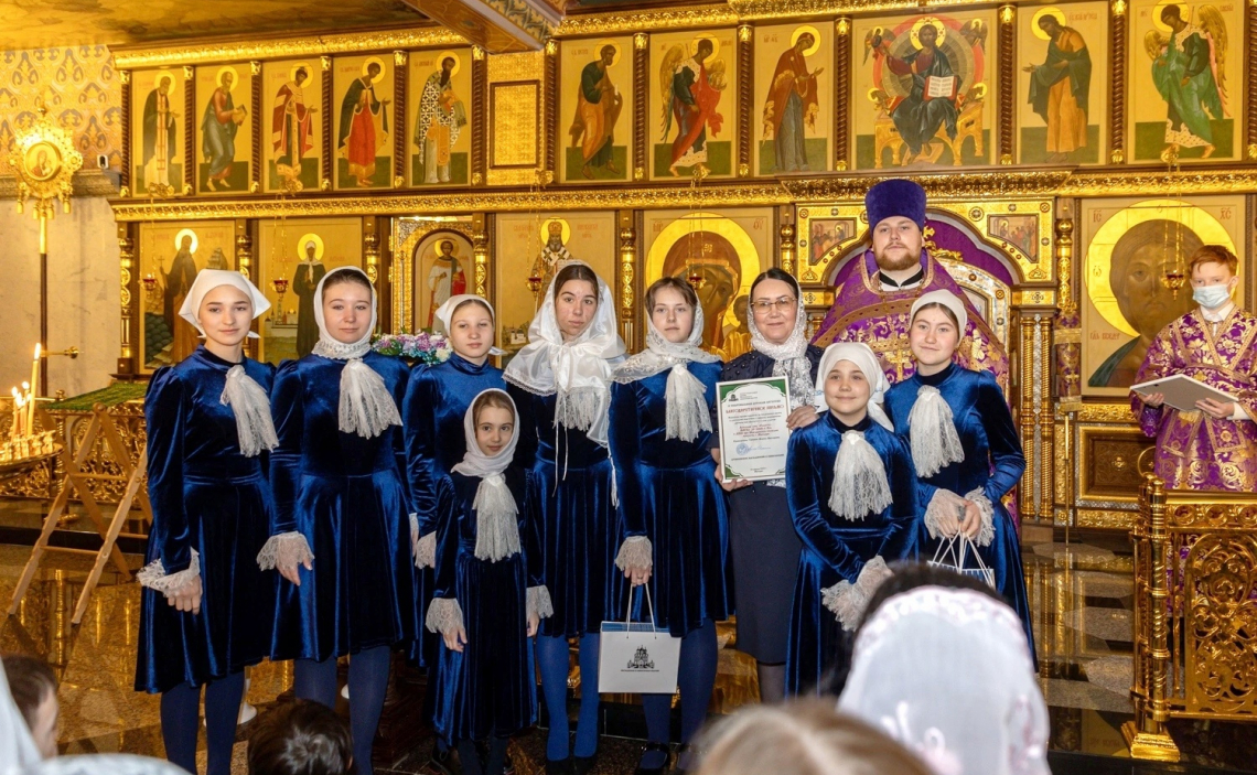 Также были вручены архиерейские благодарственные письма детским хоровым коллективам за подготовку и участие в литургии. Приглашенным коллективам были подарены детские Евангелия, молитвословы и другие памятные подарки.