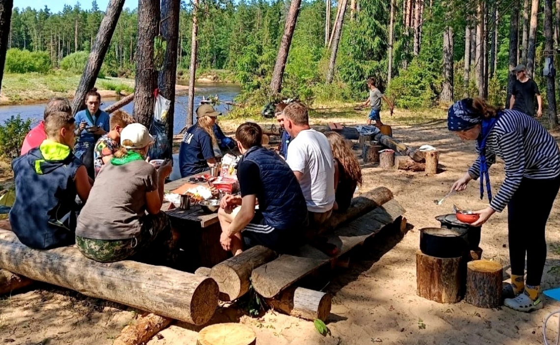 Днём ребята преодолевали на байдарках пороги и препятствия, учились грести синхронно, а на ночь устраивали привал на берегу реки, разбивали палатки, готовили еду на костре и общались.