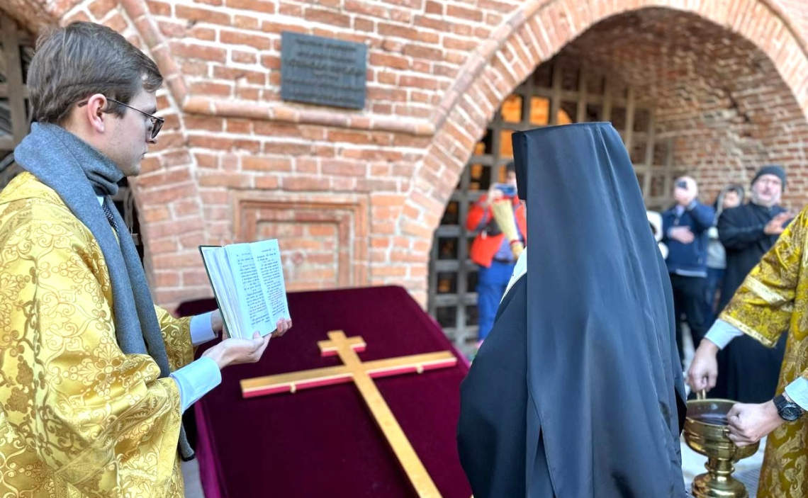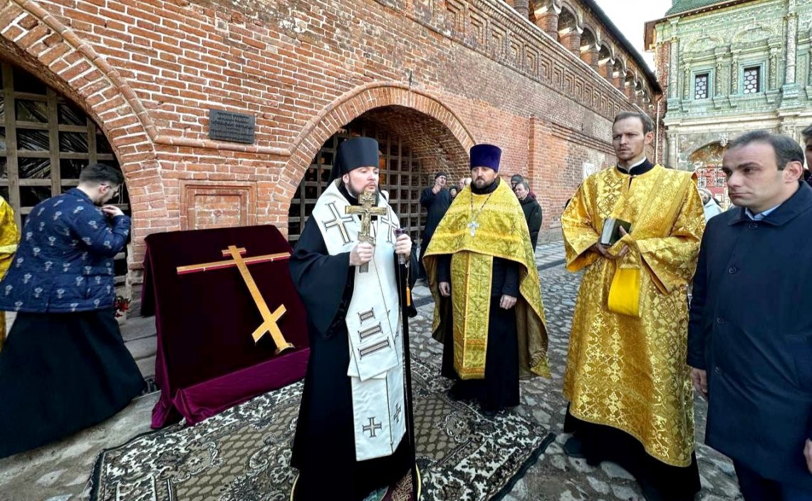 По окончании Божественной Литургии было совершено освящение нового купольного Креста для реставрируемой колокольни Крутицкого Свято-Успенского собора.