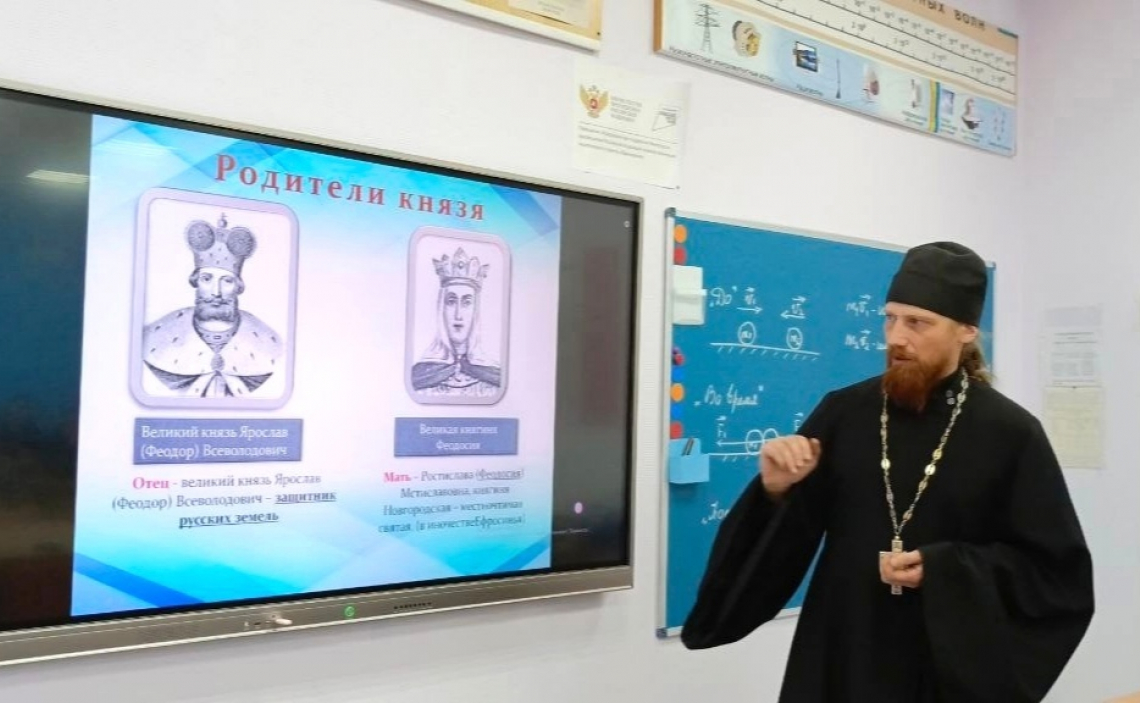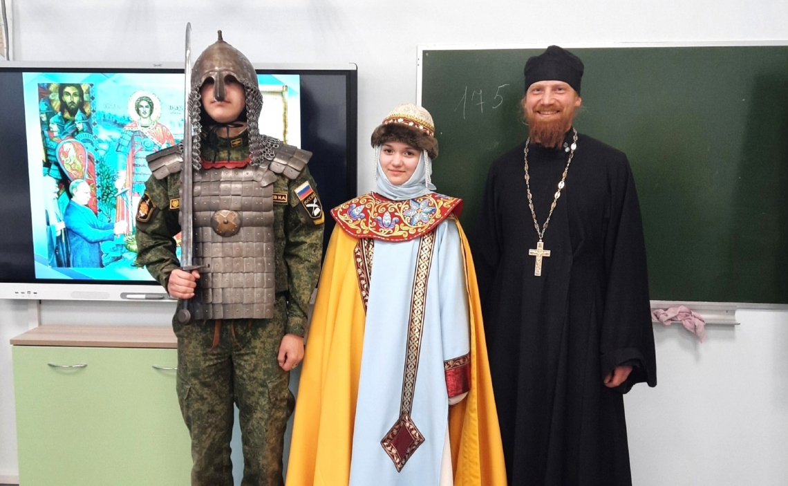 Отец Александр в увлекательной форме рассказал ребятам о жизни и подвигах благоверного великого князя Александра Невского, уделив особое внимание теме святости на Руси. В конце встречи ученики смогли погрузиться в атмосферу того времени, примеряя костюмы из музея святого Александра Невского Центра православной культуры Городецкого Феодоровского мужского монастыря.