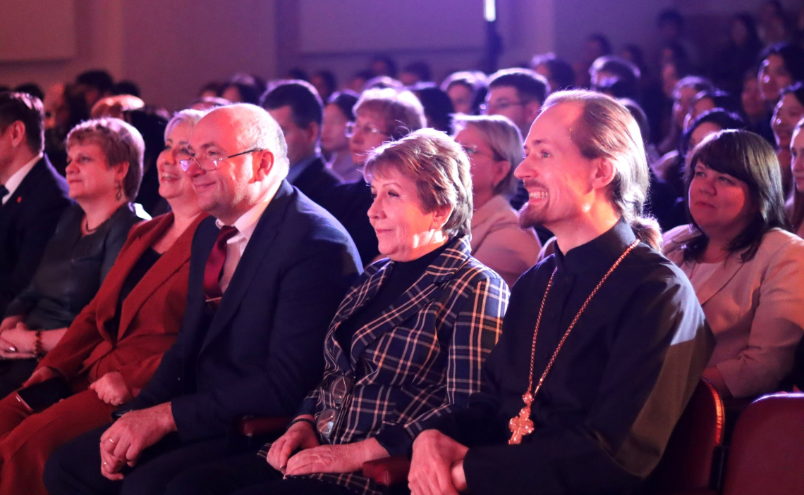 Отец Иоанн поздравил новоиспеченных студентов, напомнив, что слово «образование» происходит от слова «образ» Божий, то есть возвращение к тому образу Божиему, который был в нас заложен и пожелал каждому из ребят стать человеком, достойным своего высшего призвания. Также с приветственным словам выступила ректор вуза Жанна Константиновна Леонова, которая вместе с проректорами передала первокурсникам символические ключи от Университета.