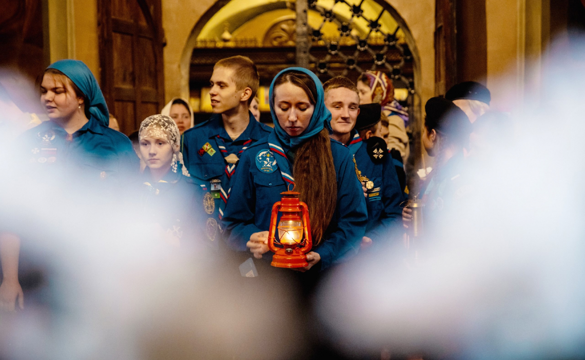 Традиционно огонь, зажженный от лампады в храме Рождества Христова в Вифлееме, по эстафете доставляют в специальных лампах по всей Европе. В этом году торжественная церемония передачи огня российским следопытам прошла 21 декабря в храме в честь иконы Божией Матери «Неупиваемая Чаша» в г. Минске. Огонь от представителей Белорусской Республиканской Скаутской Ассоциации приняла руководитель Московского отделения Братства Православных Следопытов Екатерина Юдина.