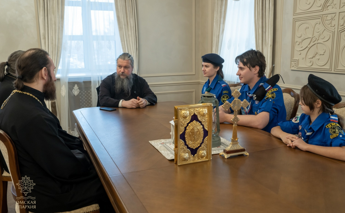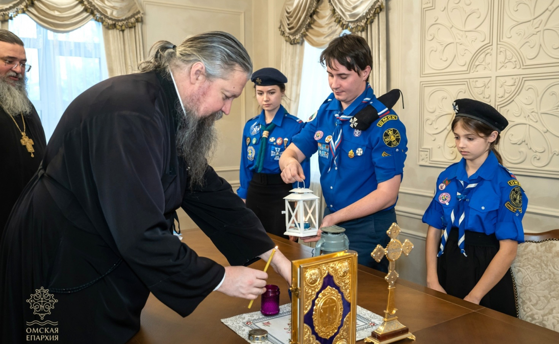 Хранители огня Омского отделения Братства православных следопытов доставили Вифлеемский огонь в епархиальную резиденцию митрополита Омского и Таврического Дионисия