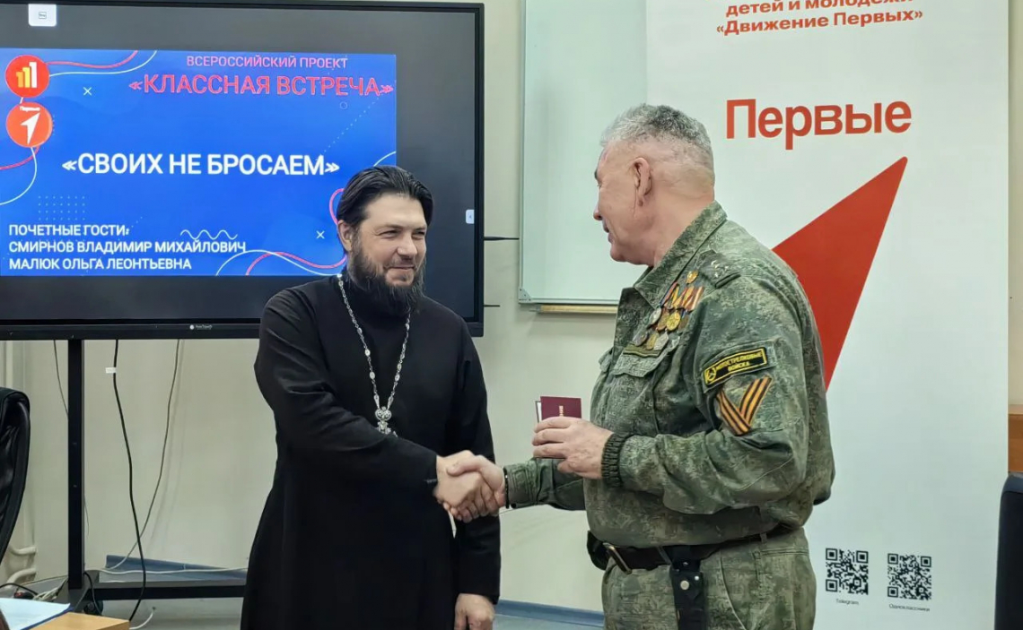 Отец Андрей рассказал учащимся и учителям классной встречи про социальную работу Новокузнецкой епархии по сбору и отправке гуманитарной помощи на фронт. Священник недавно вернулся из командировки в приграничную зону, где он окормлял госпитали. Батюшка рассказал о своей поездке, о том, как помогал раненым российским бойцам и мирным жителям, пострадавшим от действий ВСУ.