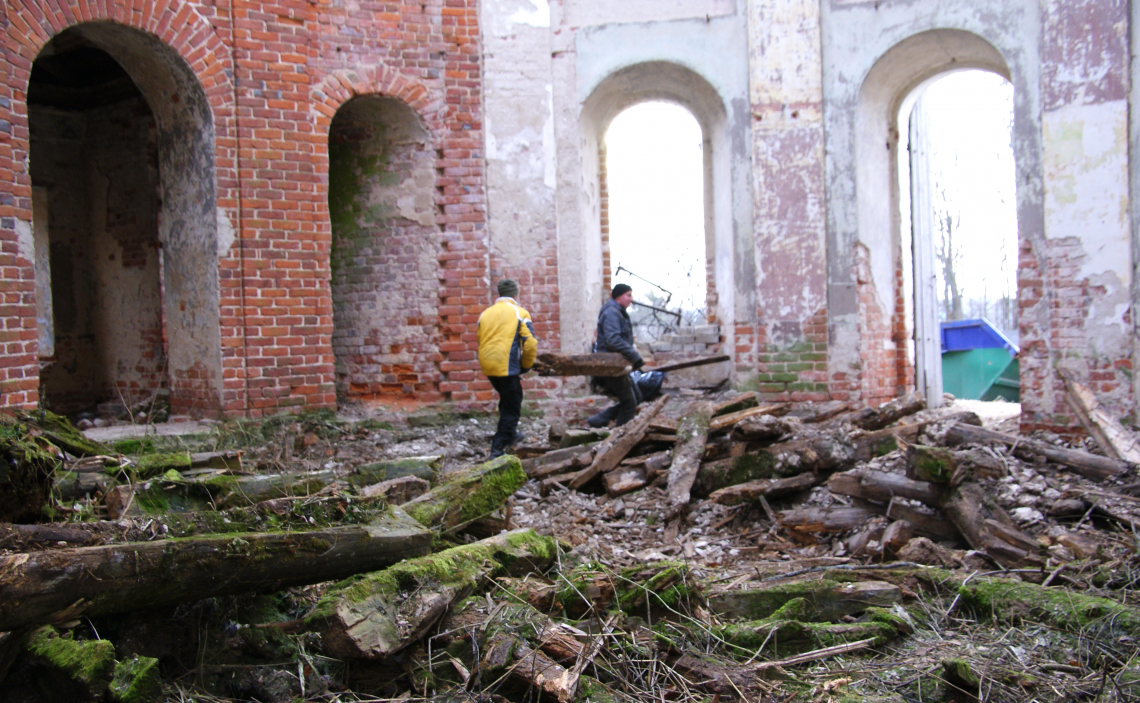 В советское время в церкви находился склад, никакой реставрации не проводилось, а несколько лет назад в круглой части строения рухнул свод. Внутри церковь оказалась завалена бревнами, остатками штукатурки, мусором, а трапезная, где уже давно нет крыши, заросла деревьями. Все это необходимо было убрать, чтобы реставраторы могли начать работу по восстановлению памятника.