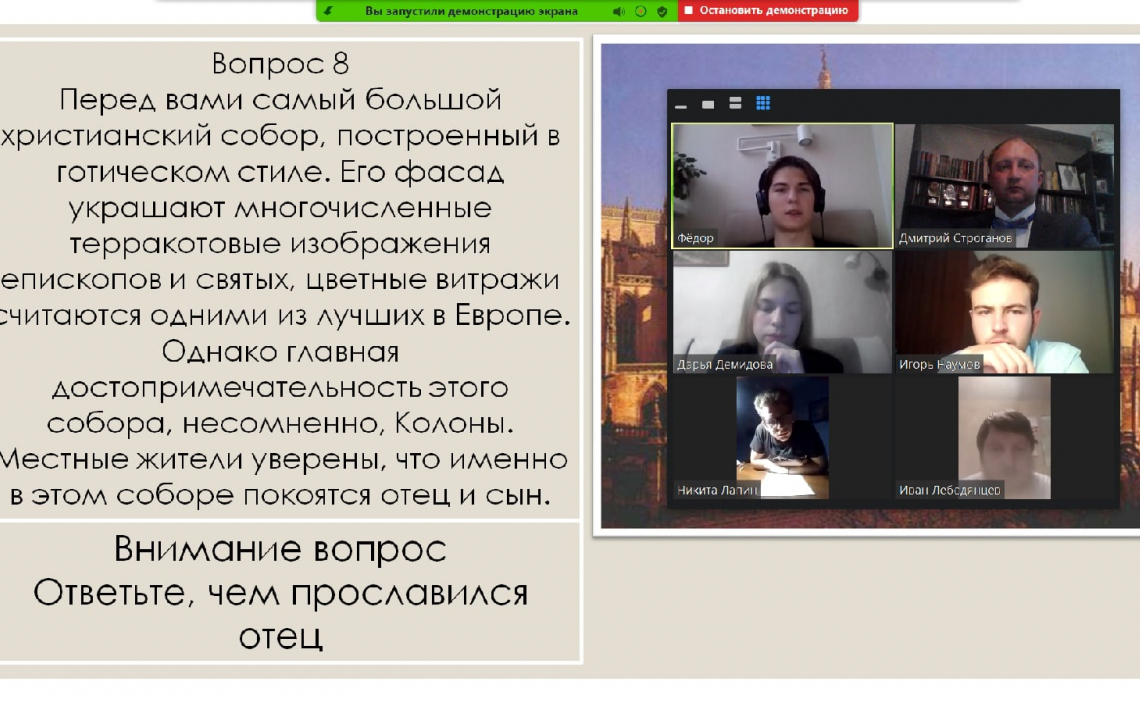 Финальное интеллектуальное состязание года прошло в онлайн-формате через платформу Zoom. Распорядителем игры по традиции стал один из её идейных вдохновителей и организаторов Дмитрий Строганов.