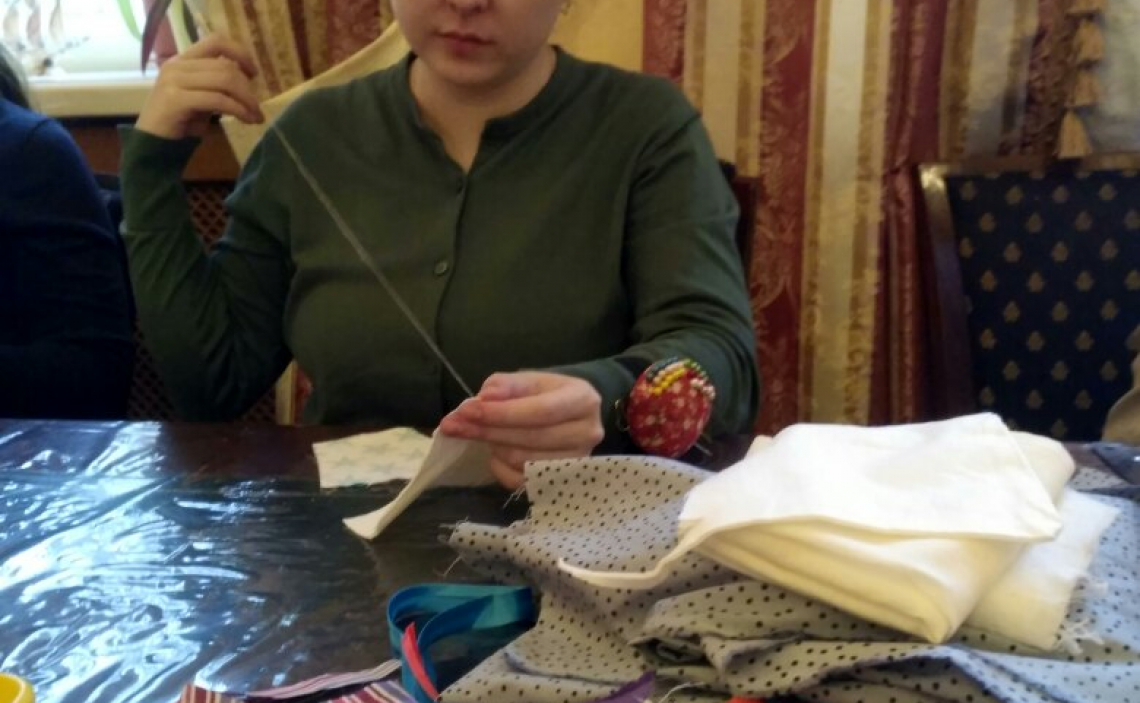 Собственно, пошив тканевой маски и был целью нашей мастерской. Участницы получили по две пары смешных тряпочек - выкроек маски. Для изнанки предназначалась белая ткань, для верхнего слоя - цветная, яркая! А дальше пришлось вооружиться ниткой, а ещё больше - терпением, и прокладывать строчку за строчкой. Казалось бы, такая простая вещь - маска, но даже она потребовала знания как минимум трёх видов швов: "назад иголка", обмёточного и "вперёд иголка". Постепенно тряпочки стали превращаться во вполне узнаваемый предмет, а после отпаривания и пришивания резинок неожиданно стали масками.