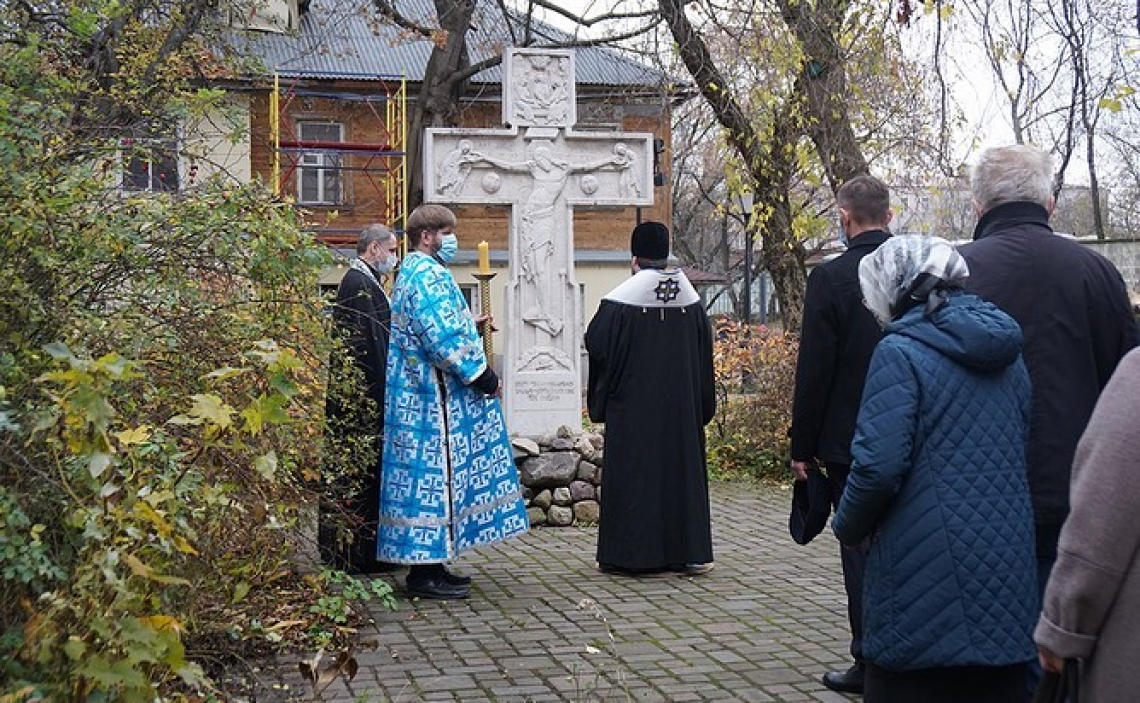 По прочтении благодарственных молитв Владыка вместе с духовенством и прихожанами проследовал к поклонному Кресту, установленному на Крутицком подворье в 2012 году по случаю 400-летия завершения Смутного времени. Здесь была совершена заупокойная лития о князе Димитрии Пожарском, Кузьме Минине и «всех воинах живот свой за веру, Отечество и освобождение Москвы положивших». После литии Архипастырь окропил молившихся прихожан святой водой.