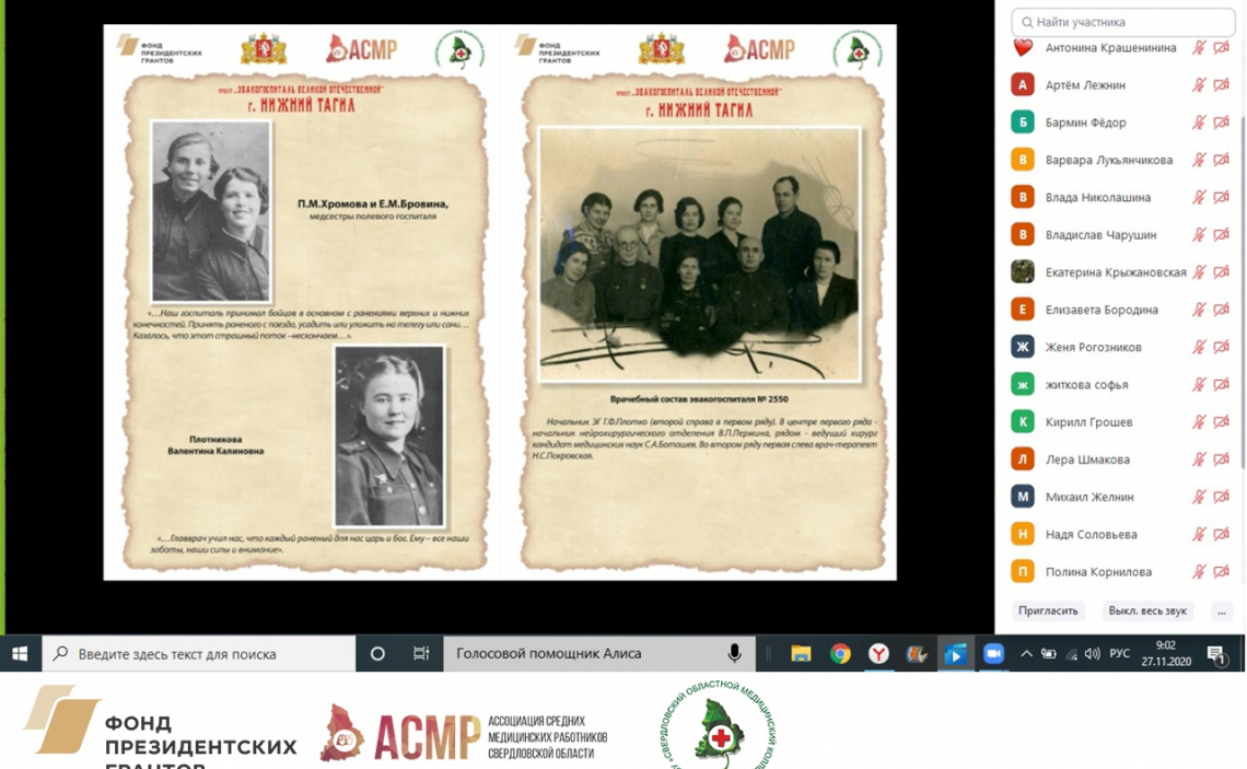 С марта по декабрь 2020 года Ассоциация средних медицинских работников Свердловской области при поддержке Фонда Президентских грантов реализует на территории Екатеринбургской митрополии проект «Эвакогоспиталь Великой Отечественной», нацеленный на сохранение исторической памяти и увековечивание героического подвига медицинских работников Урала в годы Великой Отечественной войны 1941-1945 гг.