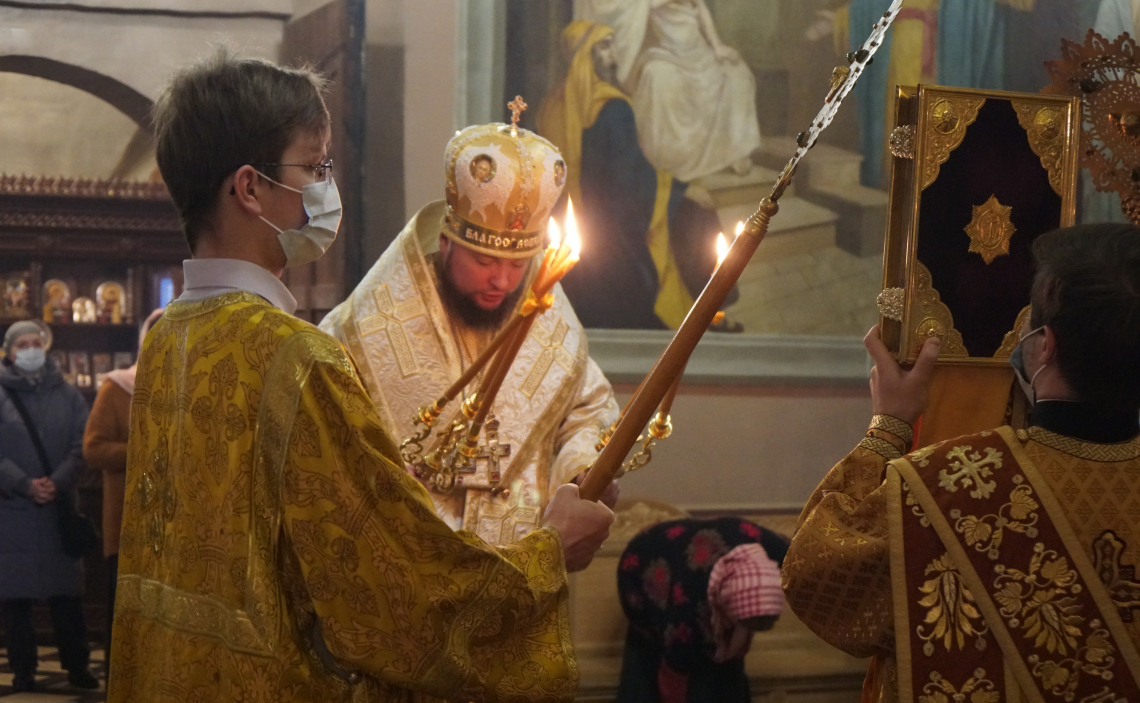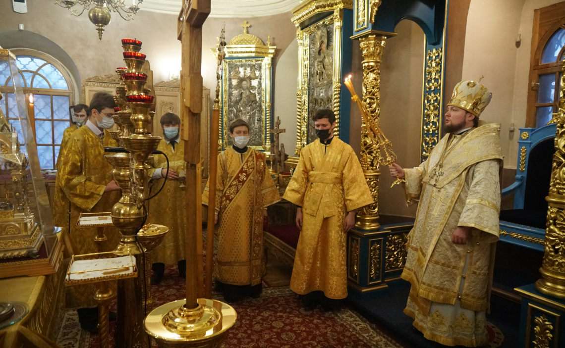 По сугубой ектении Владыка вознес молитву «во время губительного поветрия и смертоносныя заразы», а также молитву о Святой Церкви.