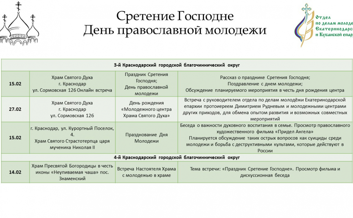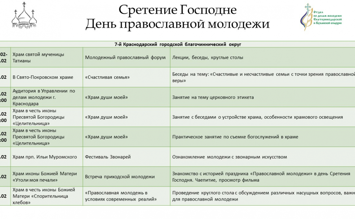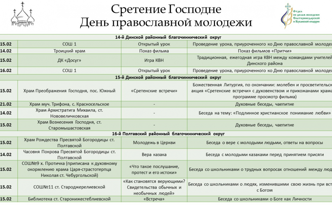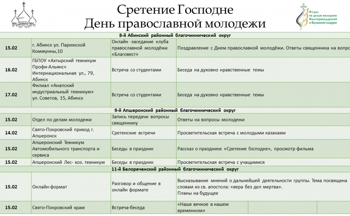 Дополнительную информацию о мероприятиях можно получить в отделе по делам молодежи епархии: pravoslavmolodezh@yandex.ru; https://instagram.com/kubanpravmol?igshid=1cmqqekahpa1o .