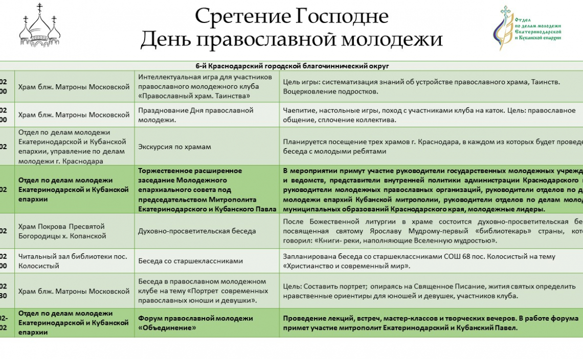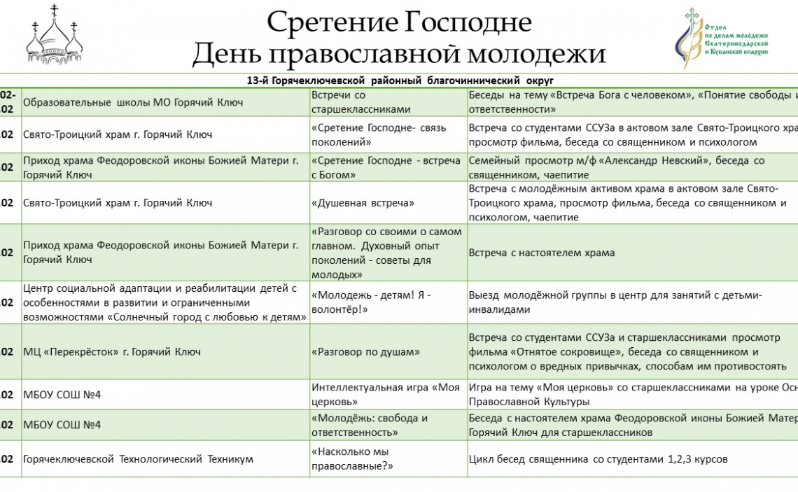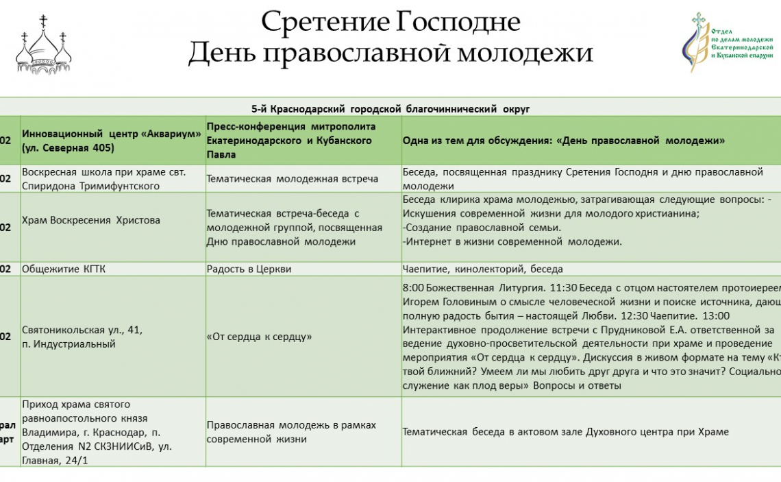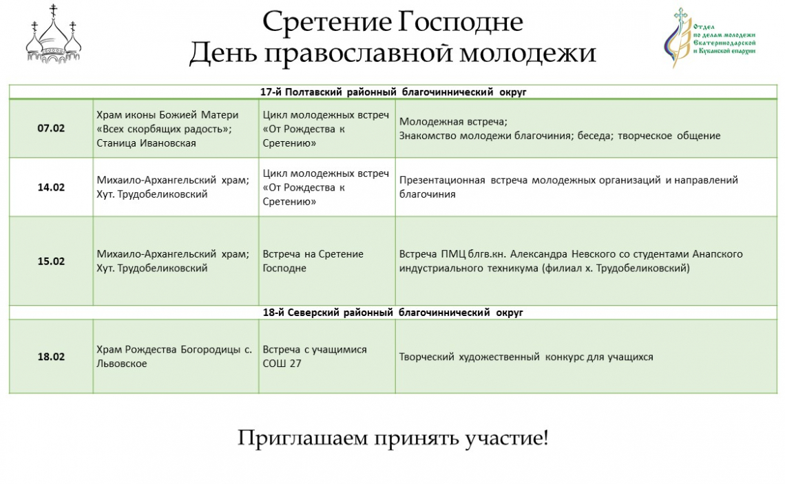Дополнительную информацию о мероприятиях можно получить в отделе по делам молодежи епархии: pravoslavmolodezh@yandex.ru; https://instagram.com/kubanpravmol?igshid=1cmqqekahpa1o .