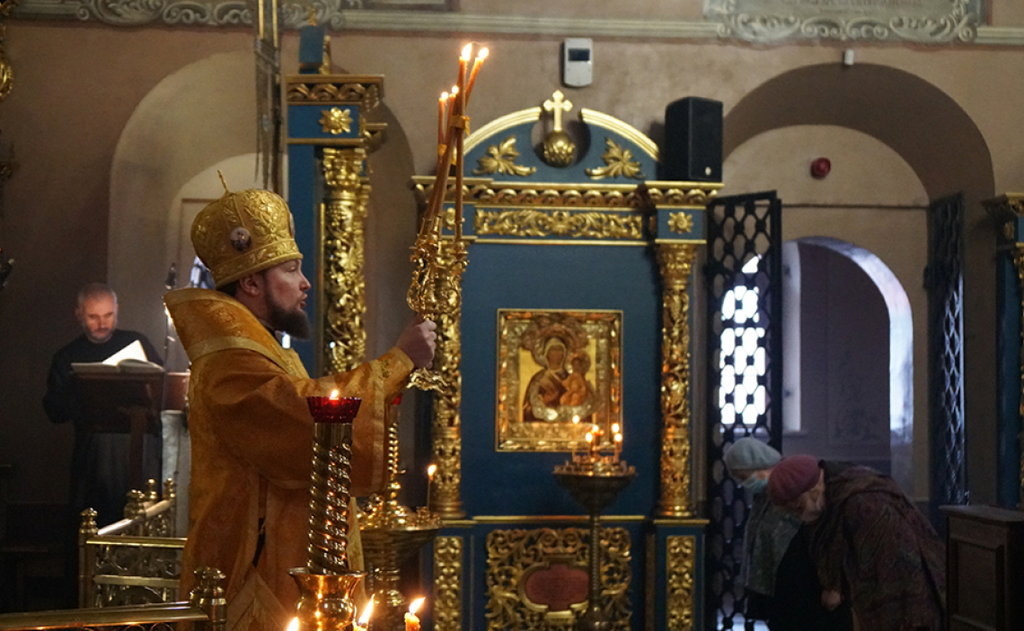 За Божественной Литургией по сугубой ектении Владыка вознес молитву «во время губительного поветрия и смертоносныя заразы», а также молитву о Святой Церкви.