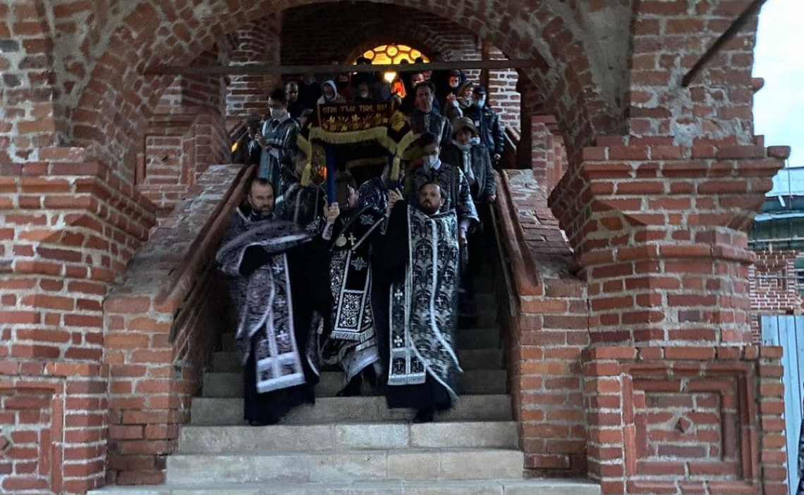 По окончании великого славословия с пением погребального «Святый Боже» Плащаница была обнесена крестным ходом вокруг Свято-Успенского собора.