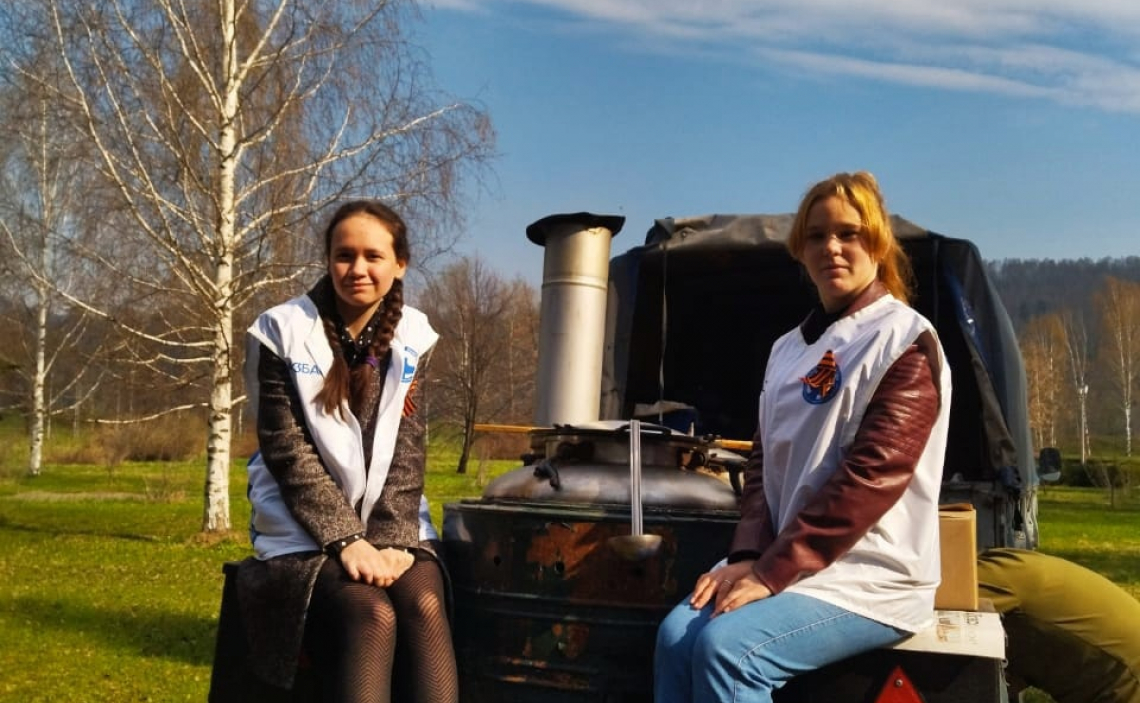 А 9 мая волонтёры клуба помогли в организации полевой кухни на городском праздновании. В парке культуры и отдыха г. Междуреченска был организован праздничный концерт, на котором выступали духовой оркестр и хор русской песни. Неподалеку на лужайке поставили шатёр с мягкими лавочками, где и располагалась полевая кухня. Ребята встречали ветеранов, тружеников тыла, детей блокадного Ленинграда и жителей города и угощали их гречкой с тушенкой и сладким чаем с булочками.