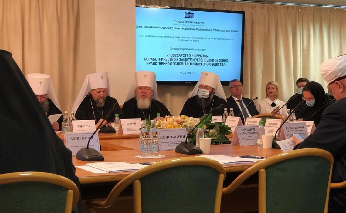 18 мая в Государственной Думе прошел круглый стол на тему «Государство и церковь. Соработничество в защите и укреплении духовно-нравственной основы российского общества». Мероприятие состоялось после пленарного заседания IX Парламентских встреч, организованных в Государственной Думе Федерального Собрания Российской Федерации в рамках XXIX Международных образовательных чтений «Александр Невский: Запад и Восток, историческая память народа».