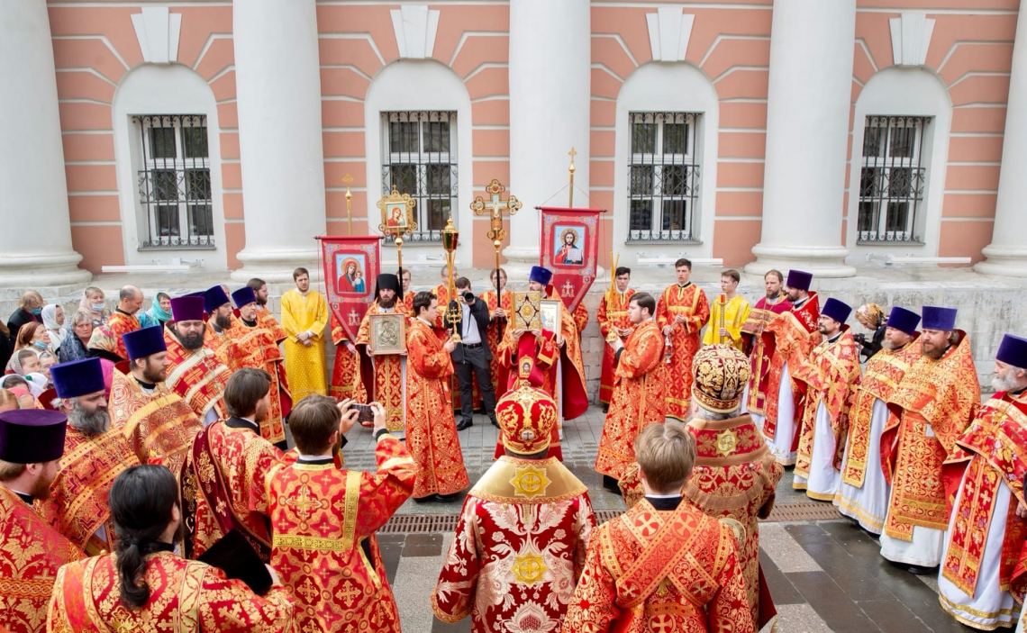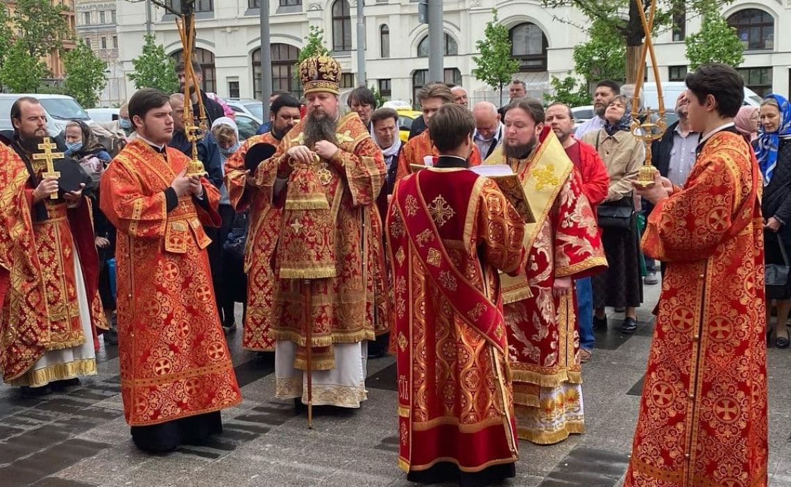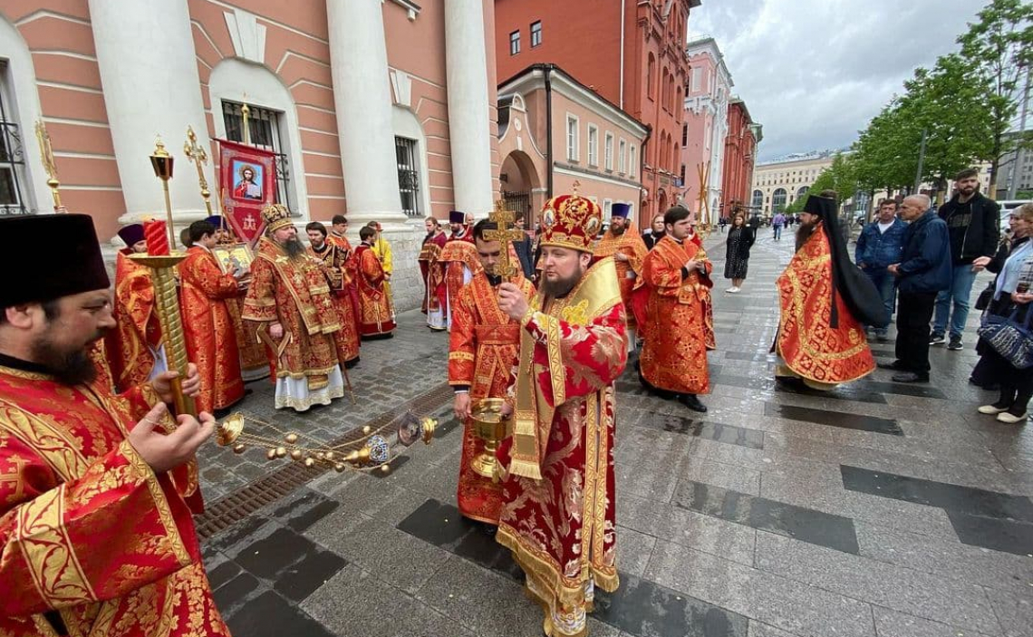 Литургия завершилась Крестным Ходом вокруг храма апостола Иоанна Богослова под Вязом, после чего Митрополит Дионисий обратился к собравшимся с архипастырским словом, передав участникам Богослужения благословение Святейшего Патриарха Московского и всея Руси Кирилла и поздравив с праздником.