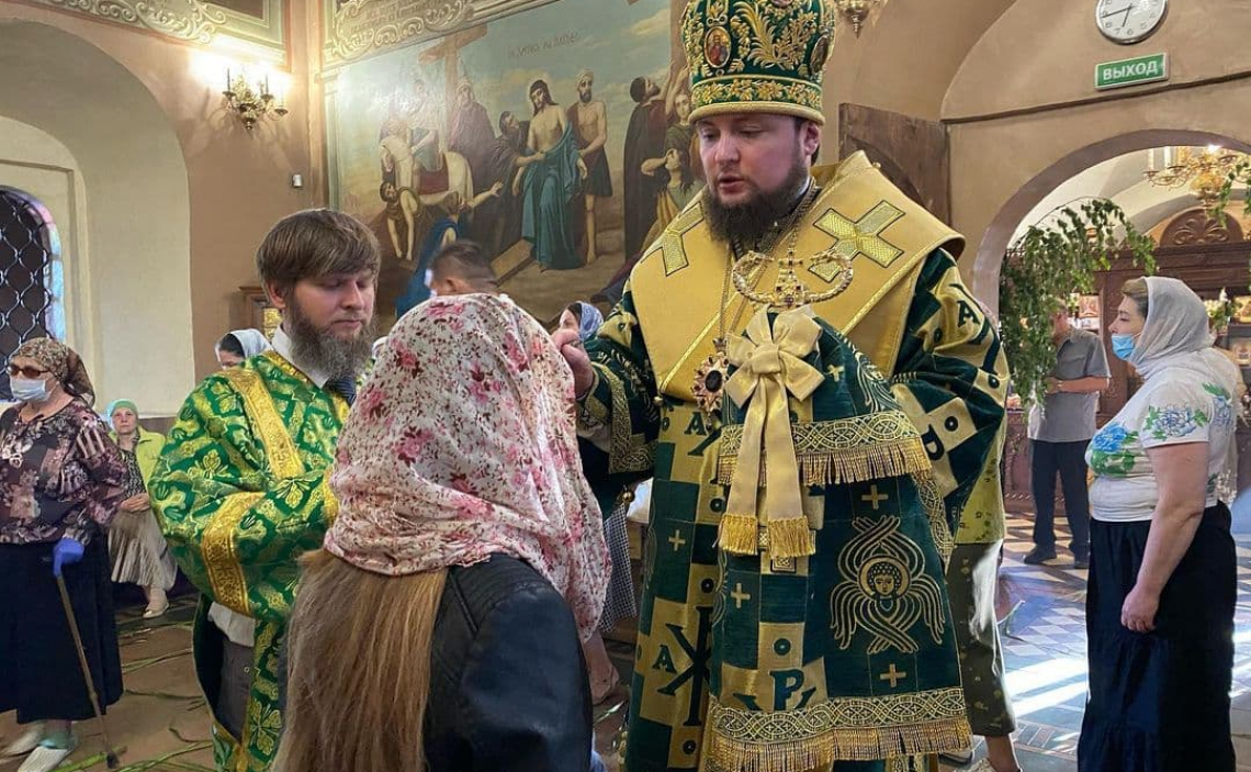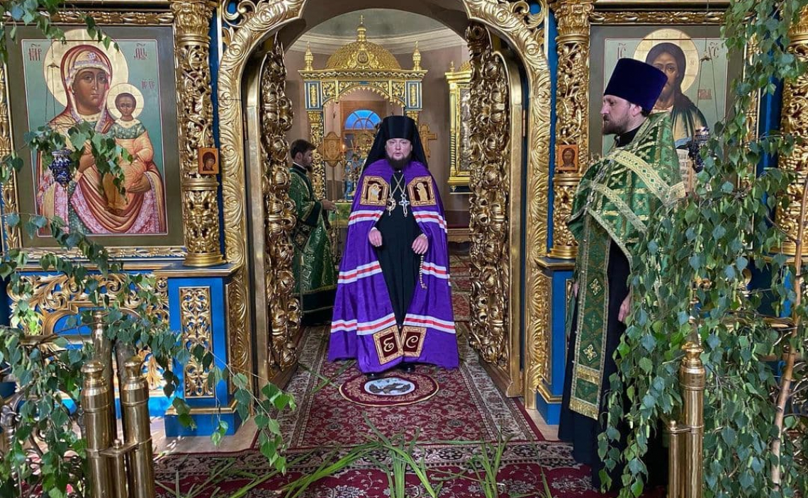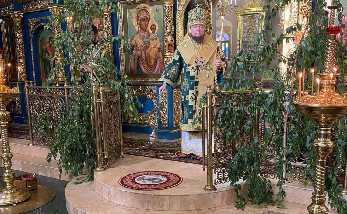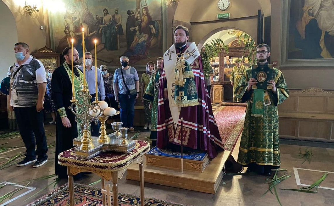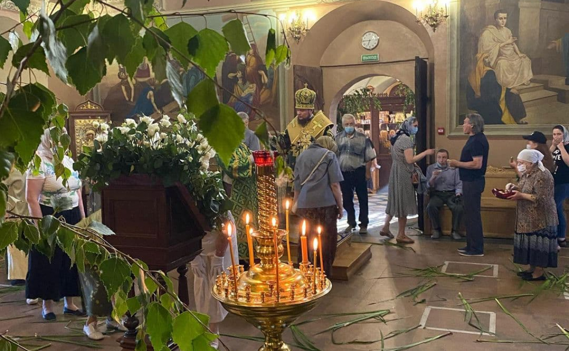 К празднику Свято-Успенский собор храм украсили березовыми ветвями, в зелёные ризы облачились священнослужители – этот цвет символизирует благодать Святого Духа.