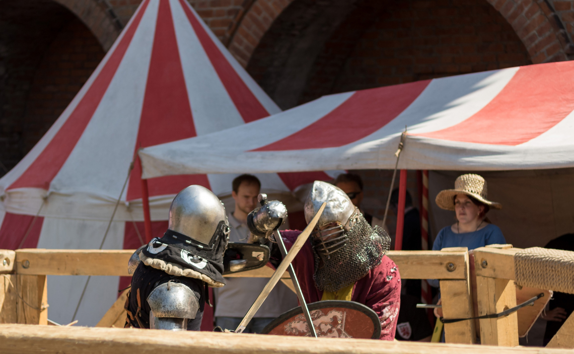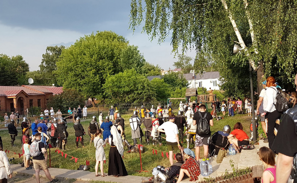 Первый фестивальный день продолжился показательными рыцарскими поединками, турнирами по историческому фехтованию. Юные гости могли почувствовать себя настоящими воинами, приняв участие в боях на мягком вооружении.