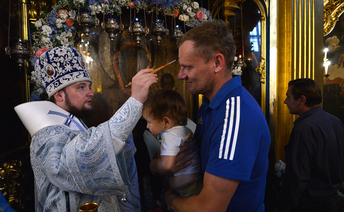 После чтения Святого Евангелия у иконы Божией Матери Одигитрии митрополит Исидор, епископ Серафим и протоиерей Михаил Горовой совершили помазание верующих освященным елеем.