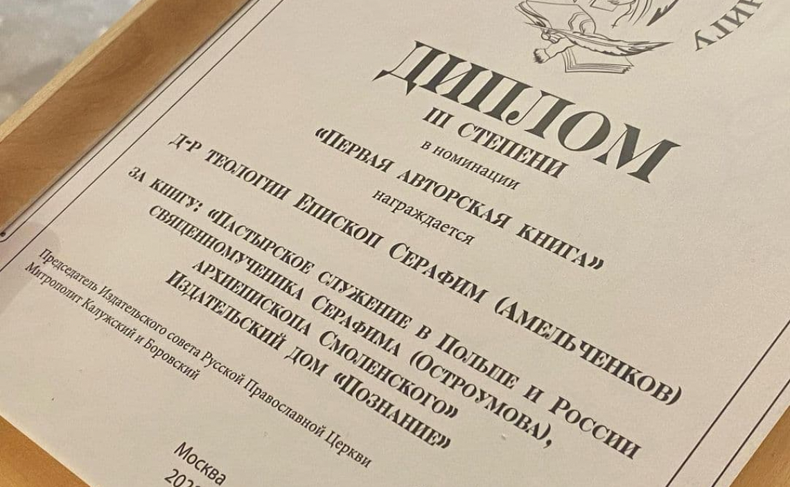 На XVI призовой сезон конкурса «Просвещение через книгу» было подано 179 заявок. По итогам работы конкурсной комиссии были определены 55 лауреатов, среди них книга «Пастырское служение в Польше и России священномученика Серафима (Остроумова), архиепископа Смоленского», написанная епископом Истринским Серафимом. Монография заняла призовое место в номинации «Первая авторская книга».