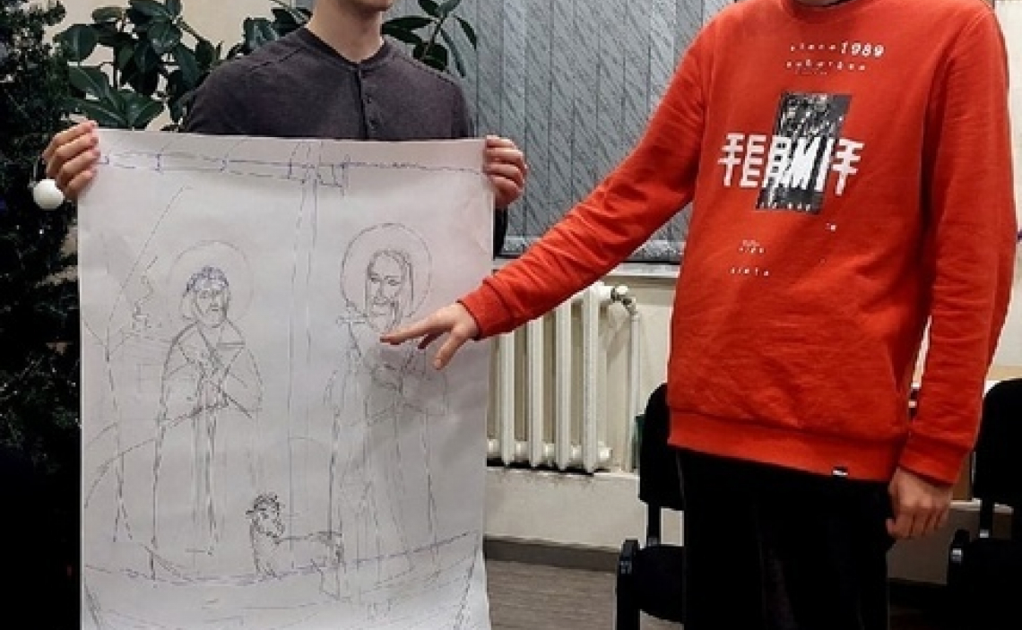 Затем каждой команде выдали по большому листу, на котором нужно было нарисовать символ этих двух святителей или то, с чем они у ребят ассоциируются, а потом пояснить свои работы.