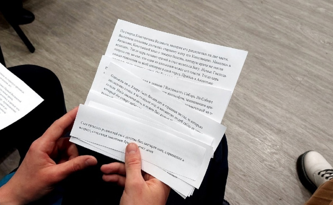 Каждой из двух групп были выданы небольшие листочки, где описывались события из жизни двух святых, память которых отмечается в Рождественский пост. Это святитель Николай Чудотворец и святитель Спиридон Тримифунтский. Оба жили в IV веке, оба пользуются громадным почитанием среди верующих. Командам надо было узнать, какие описания из житий к кому из святых подходят, затем выложить их в хронологическом порядке и рассказать историю жизни каждого угодника Божия.