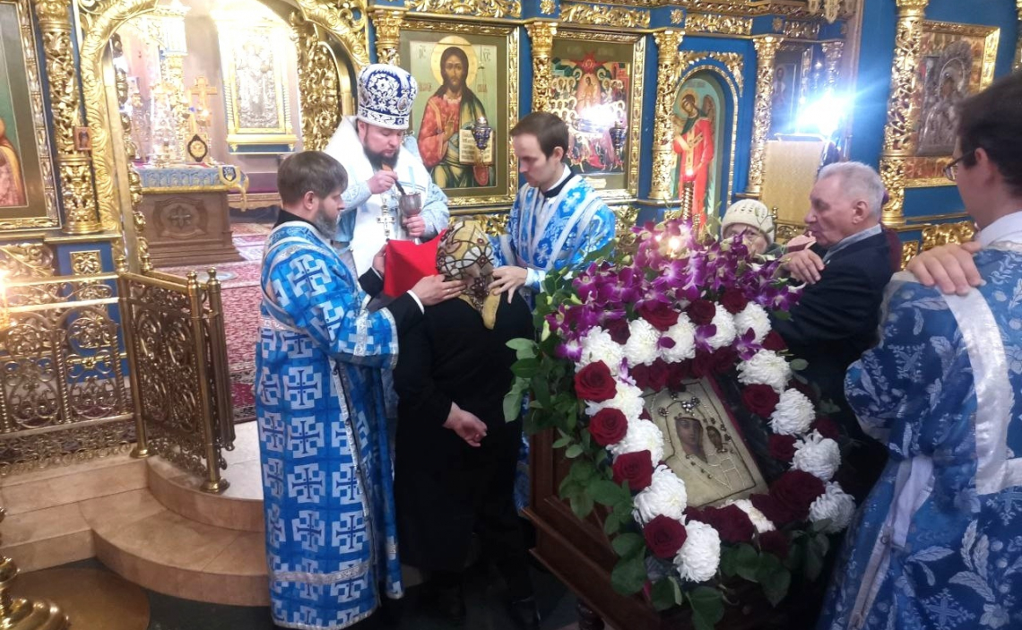 На аналое в центре храма была помещена украшенная живыми цветами чтимая Казанская икона Божией Матери. Архипастырь возглавил полиелей и великое славословие.