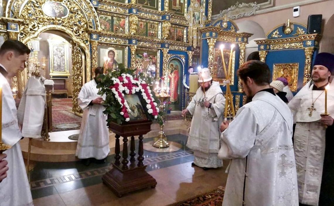 После Великого повечерия Владыка совершил чин литии с освящением хлебов, пшеницы, вина и елея, а на утрени – возглавил полиелей и великое славословие.