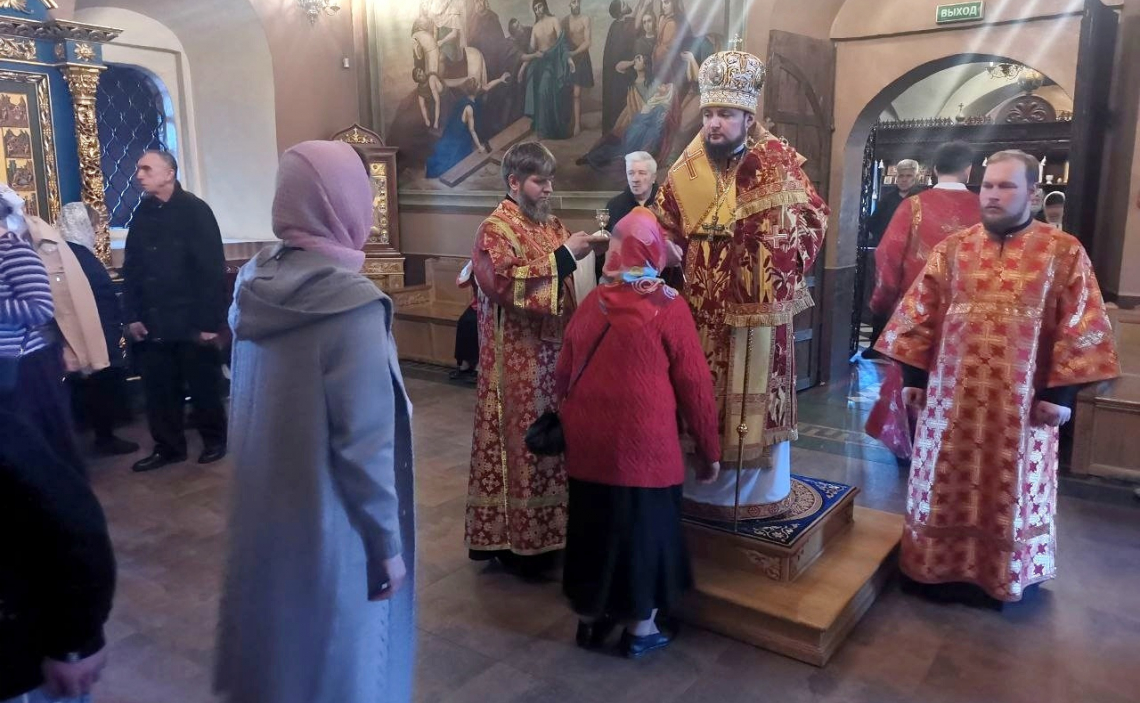 По окончании полиелея Его Преосвященство совершил помазание елеем духовенства, а также прихожан, молившихся за Богослужением.